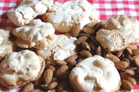 In una pirofila si montano a neve gli albumi, aggiungere poi lo zucchero mescolando molto delicatamente e porre il recipiente a bagnomaria; tenerlo su fiamma moderata finché lo zucchero sia sciolto e l’albume rappreso (occorrono dai 15-20 minuti).Togliere dal fuoco la pirofila unire le mandorle tagliate a pezzi abbastanza grossi, la farina, mescolando sempre accuratamente fino ad ottenere un composto abbastanza compatto. Disporlo a cucchiaiate sulla placa del forno lievemente imburrata ed infarinata. Mettere in forno elettrico a 150°C per 18 minuti circa a colore dorato.